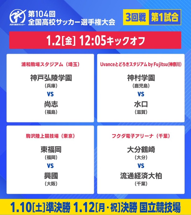 1: 阿弥陀ヶ峰 ★ 2026/01/02(金) 12:01:02.63 ID:CoVybVQA9 1月2日、第104回全国高校サッカー選手権の3回戦が首都圏内の4会場で行われる。 第1試合は1···